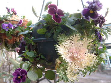 こっちは葉牡丹のハンギング。 でも このハンギング、プラスチックで全面出来ていて株がうまく広がってくれない。